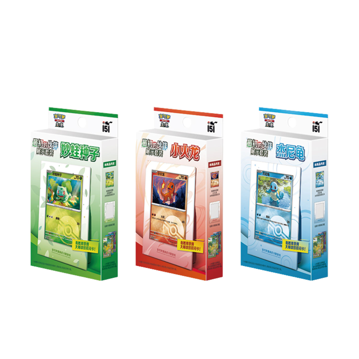共三款主題:妙蛙種子、小火龍、傑尼龜,各套裝皆附對應寶可夢全新插畫閃卡(精靈球紋樣,極低機率抽到大師球紋樣,配比約99:1)以及顏色相配的紙質展示框。
