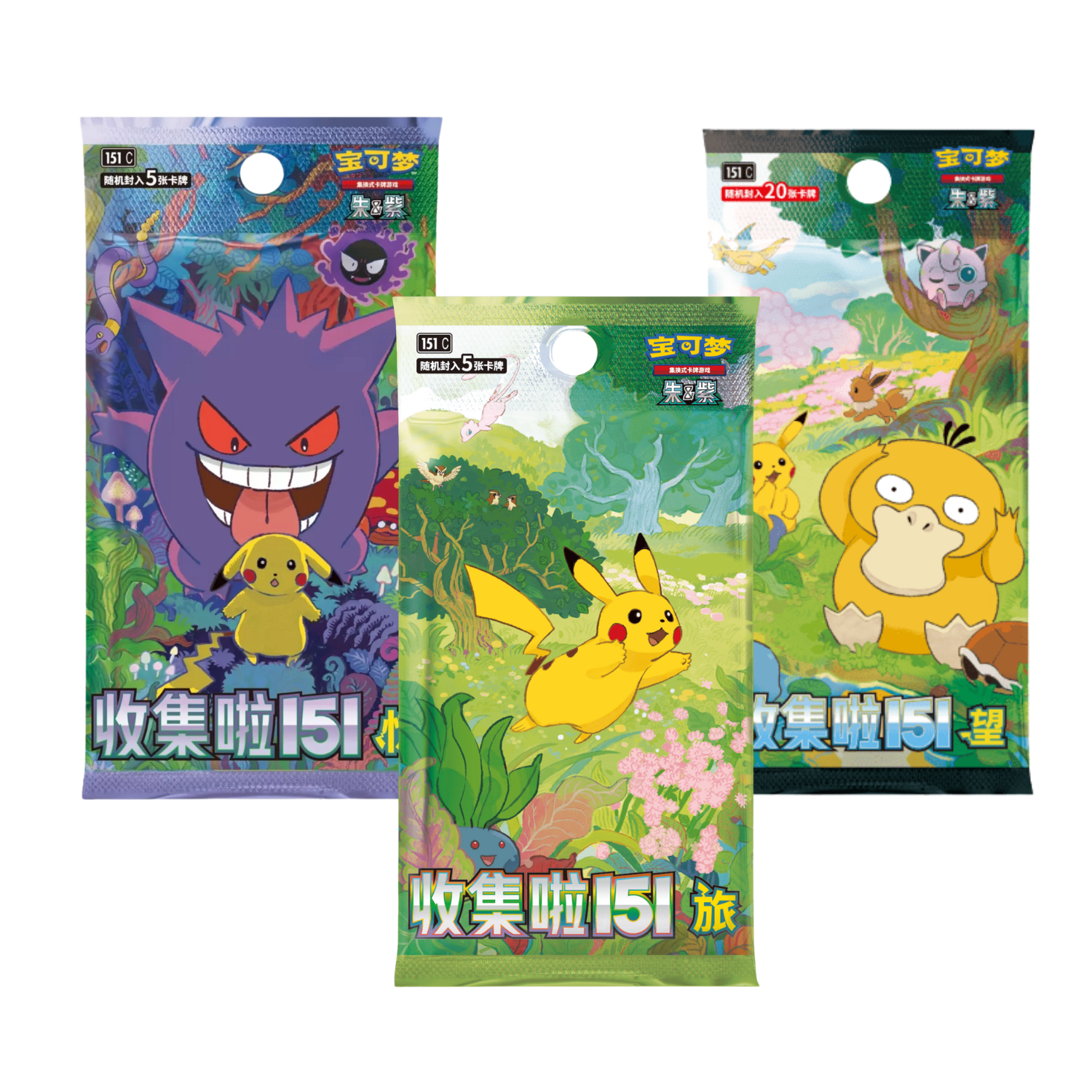 每套包含「收集啦151 旅」、「收集啦151 望」、「收集啦151 驚」三種補充包,各1包,每包5張,可抽到編號001-151的各式寶可夢卡牌。