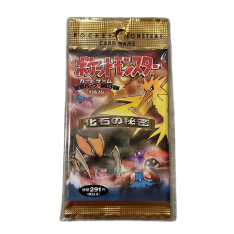 The set focuses on Generation I Pokémon, especially fossil-themed Pokémon like Aerodactyl, Kabuto, and Omanyte, as well as legendary birds such as Articuno, Zapdos, and Moltres. Other notable holos include Dragonite, Lapras, and Gengar.